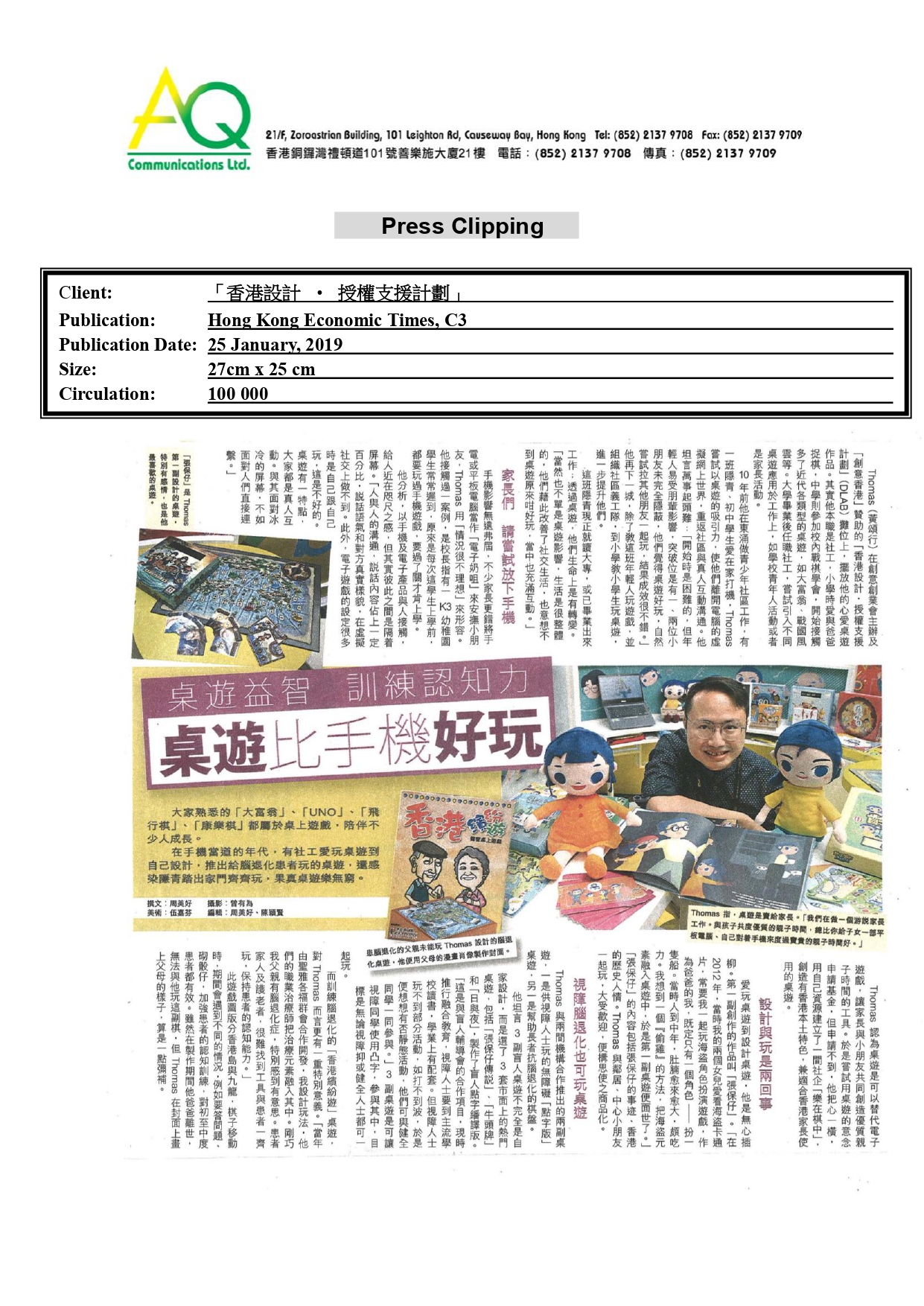 憑藉豐富的經驗和網絡,AQ能為客戶提供最合適的服務。在此項目上,AQ負責媒體關係服務,包括媒體聯絡及邀請丶現場採訪協調丶安排一對一訪問丶跟進傳媒報導以及撰寫總結報告及傳媒發佈會或聚會。