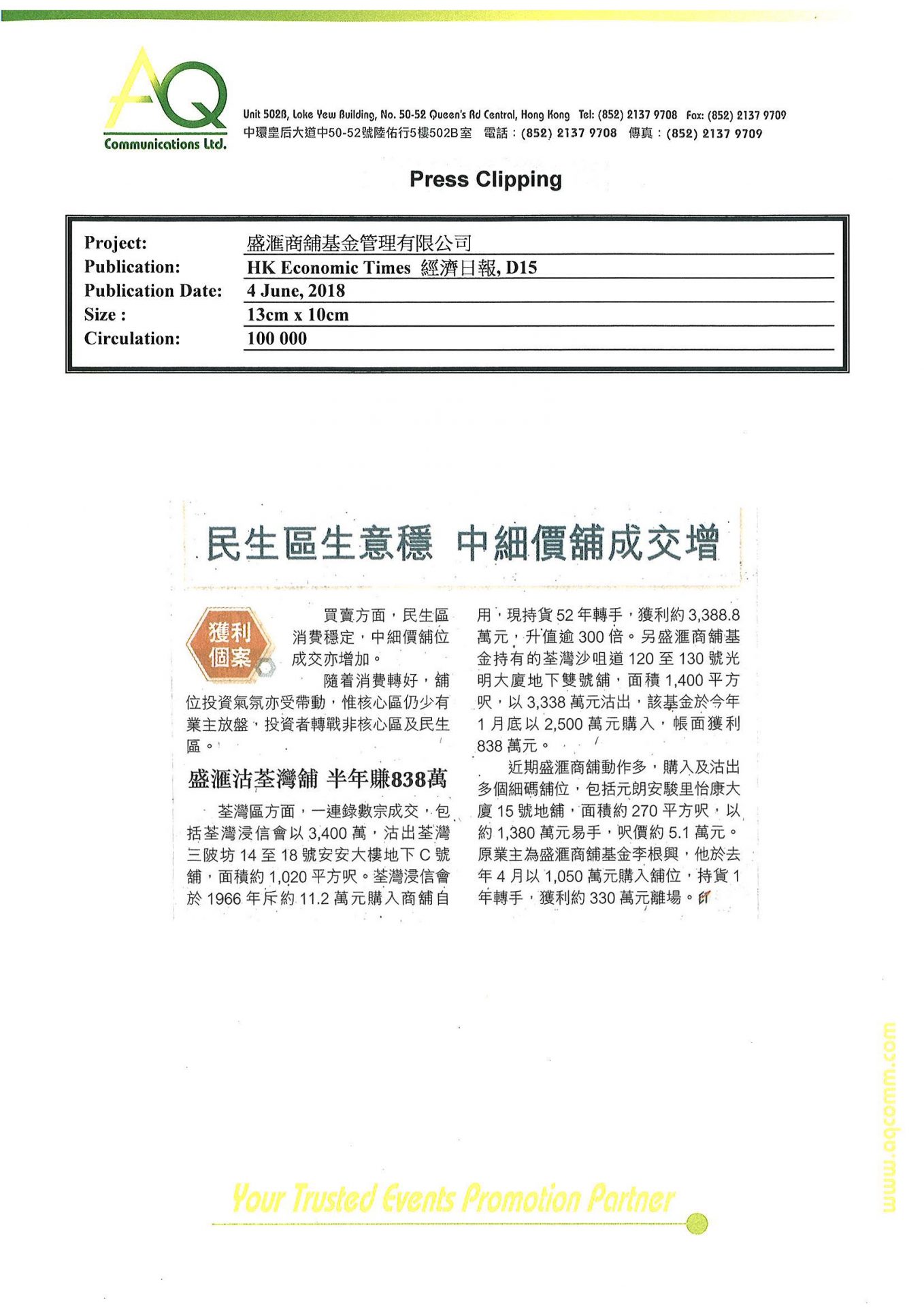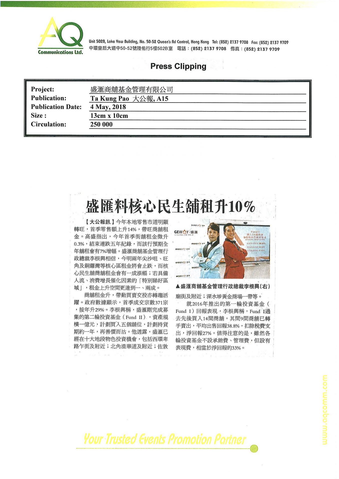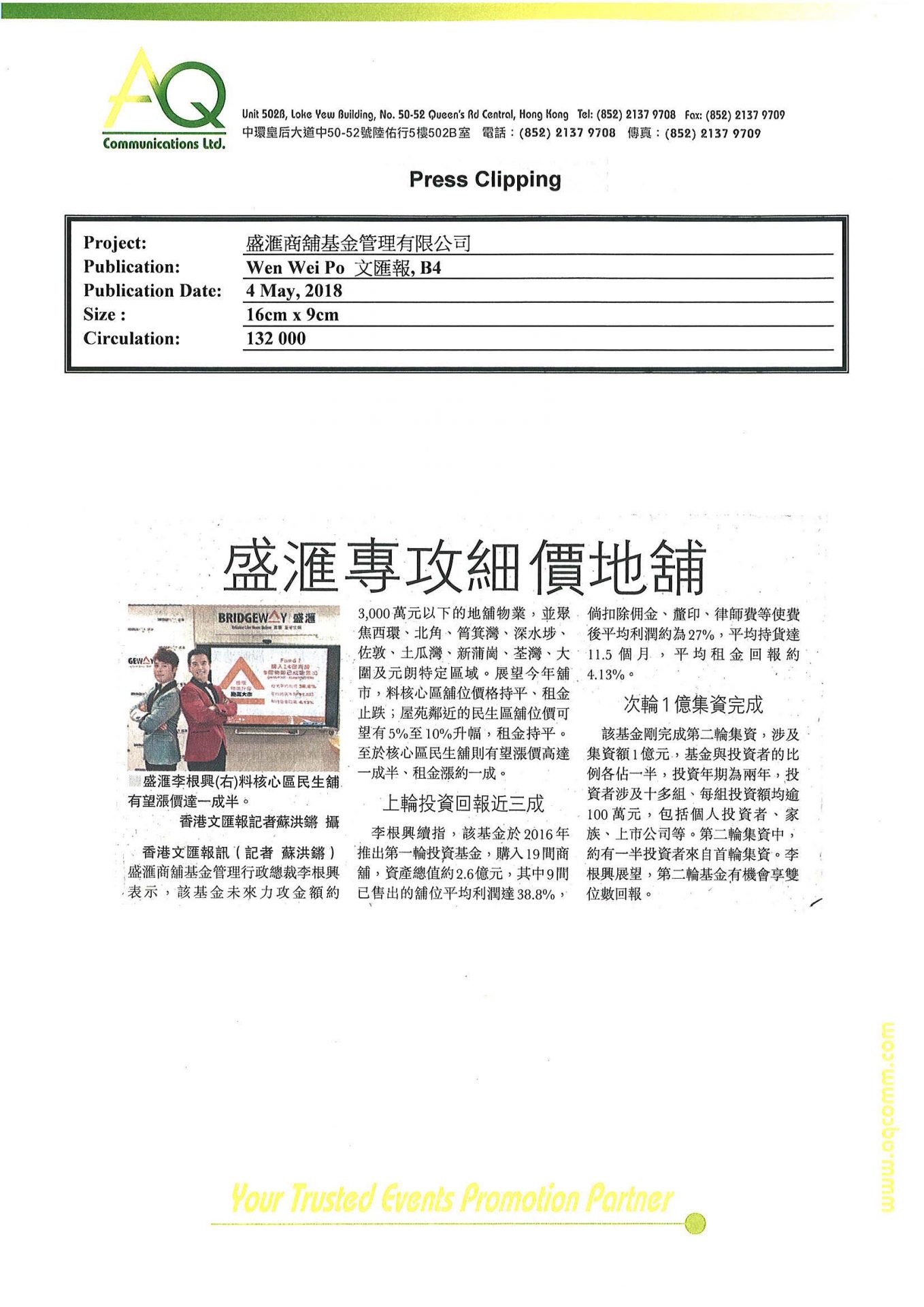 With diverse networks and experiences. AQ is capable of offering substantial services to clients. AQ is committed managing media relations and correlated service, including ongoing media awareness for 6 months.