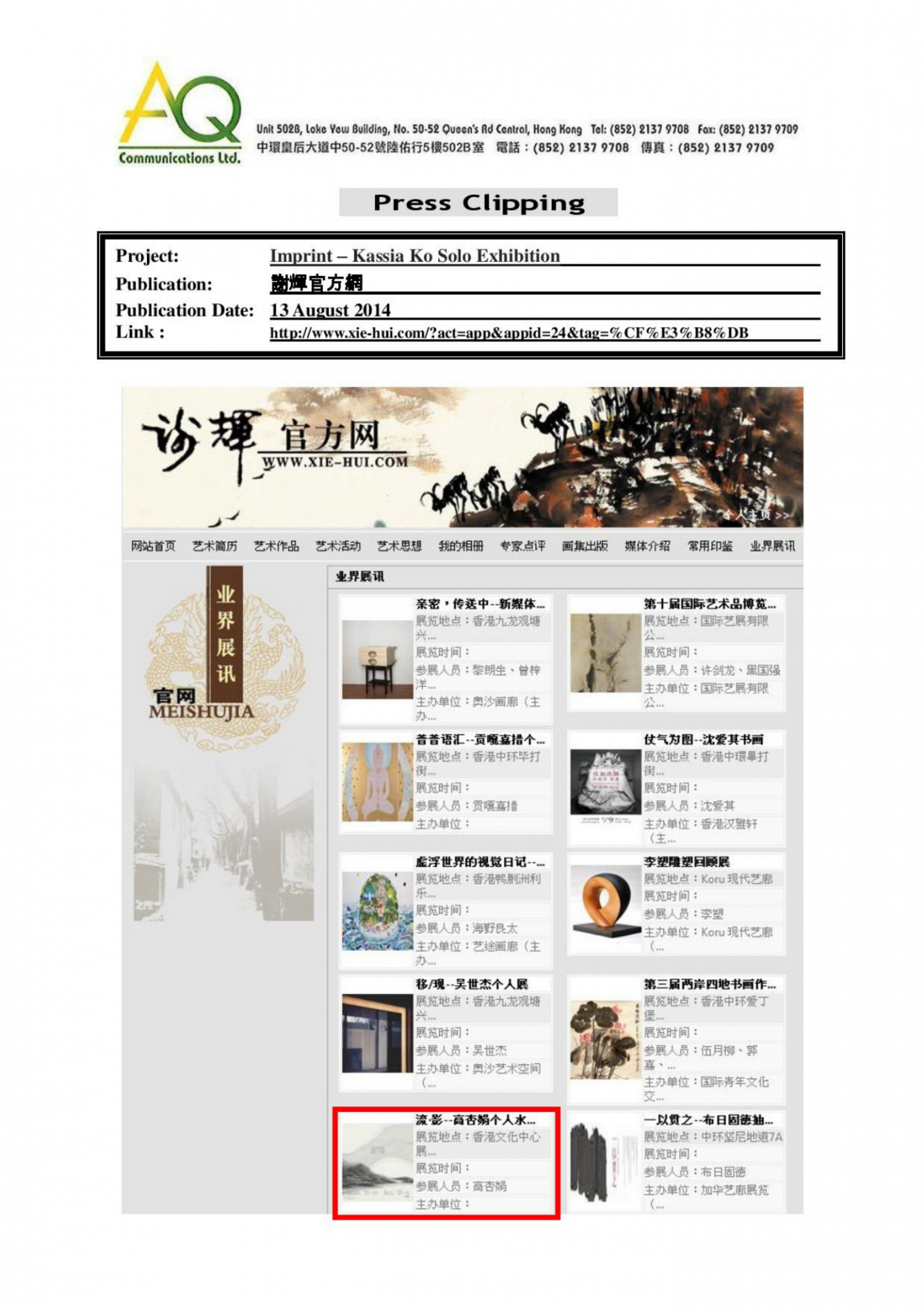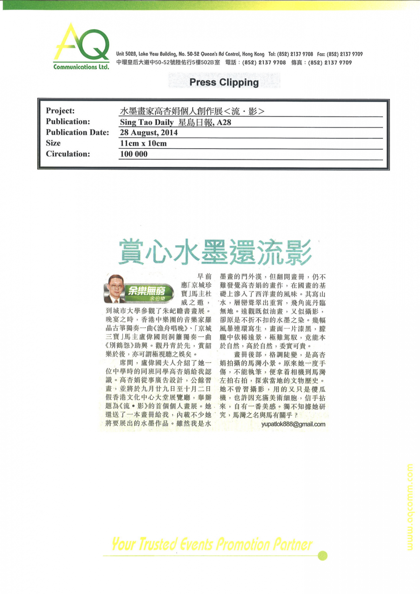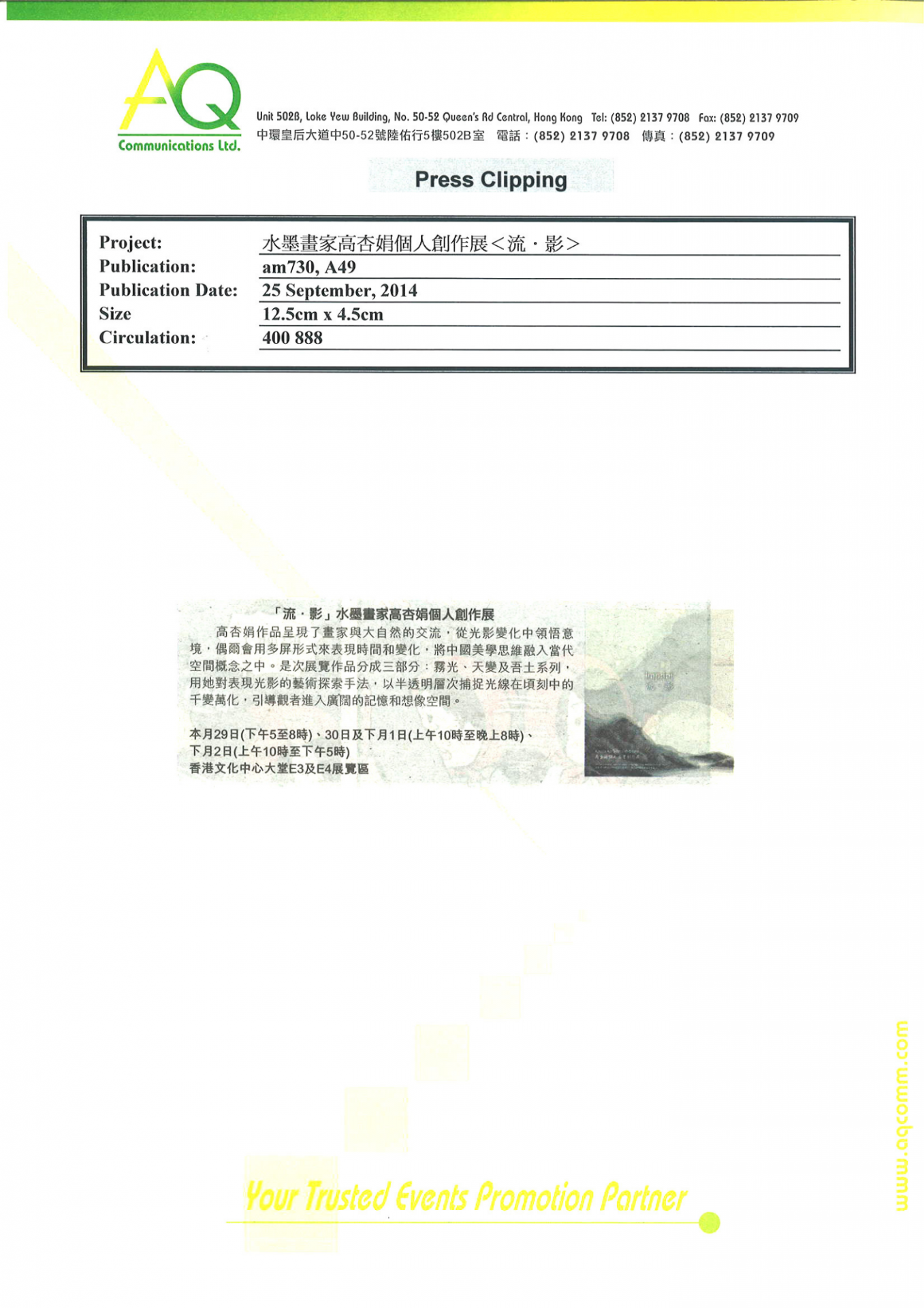 憑藉豐富的經驗和網絡,AQ能為客戶提供最合適的服務。在此項目上,AQ負責媒體關係及其相關服務,包括編寫和翻譯新聞稿丶傳媒採訪邀約、安排一對一訪問丶跟進傳媒報導以及撰寫總結報告。