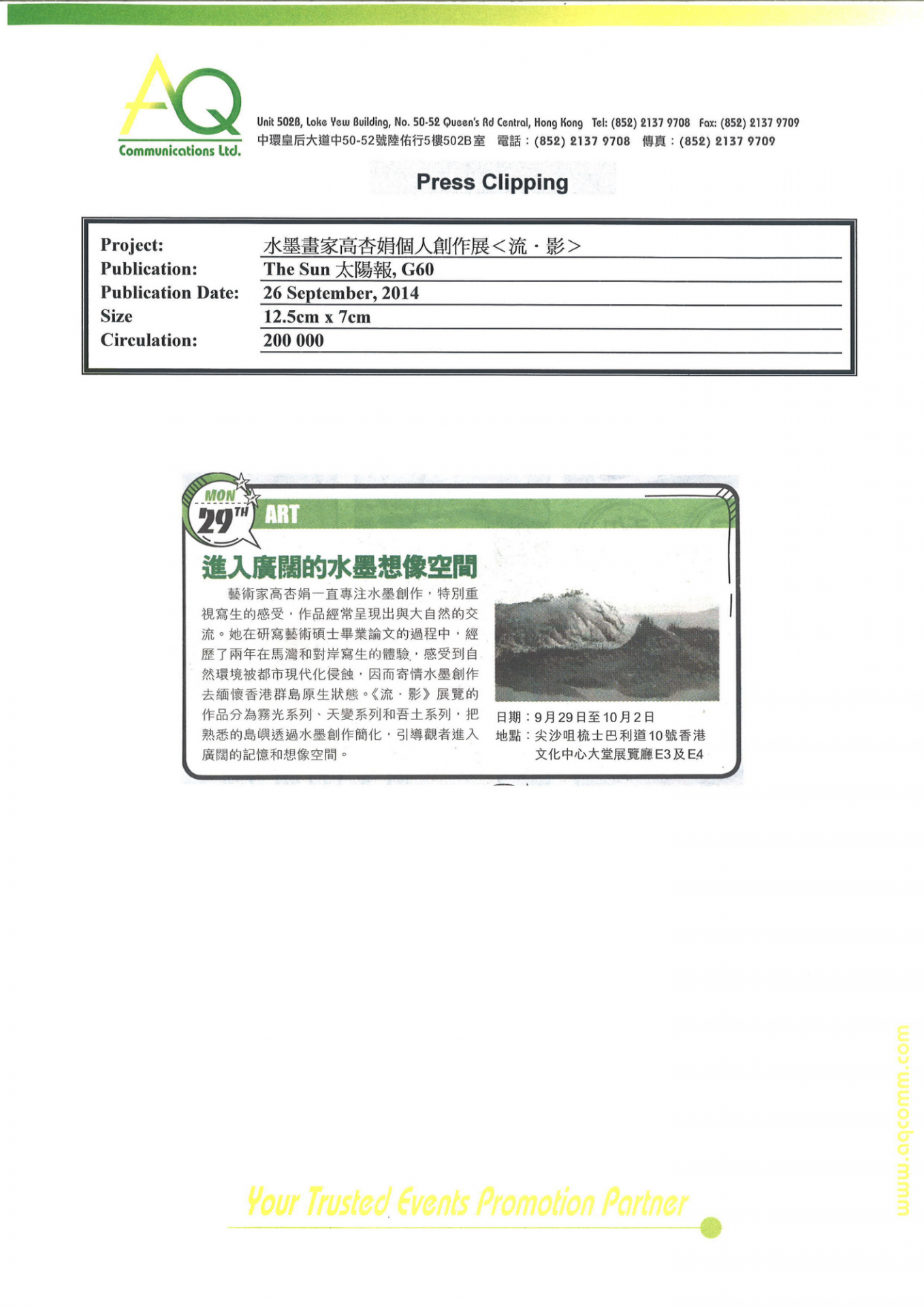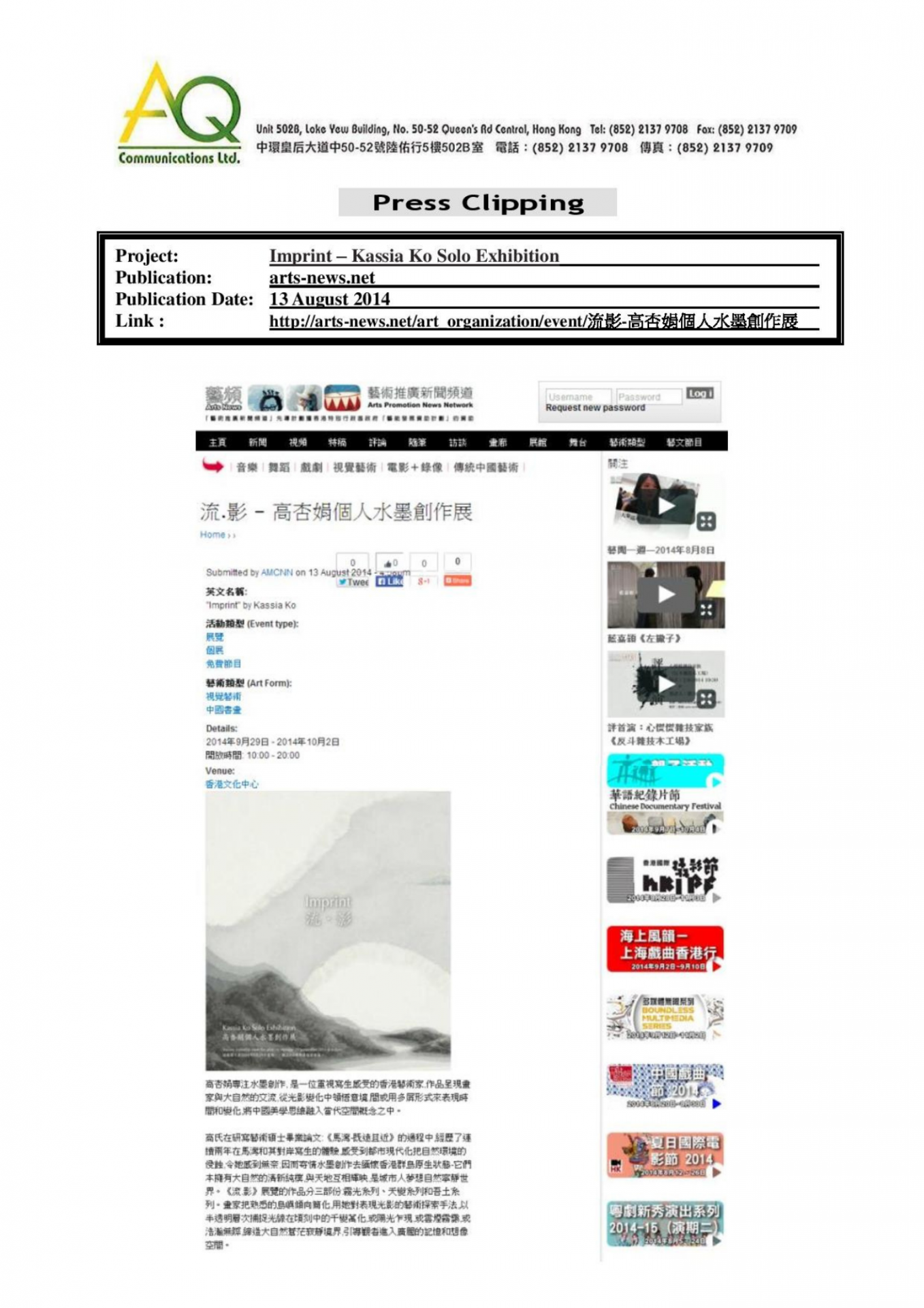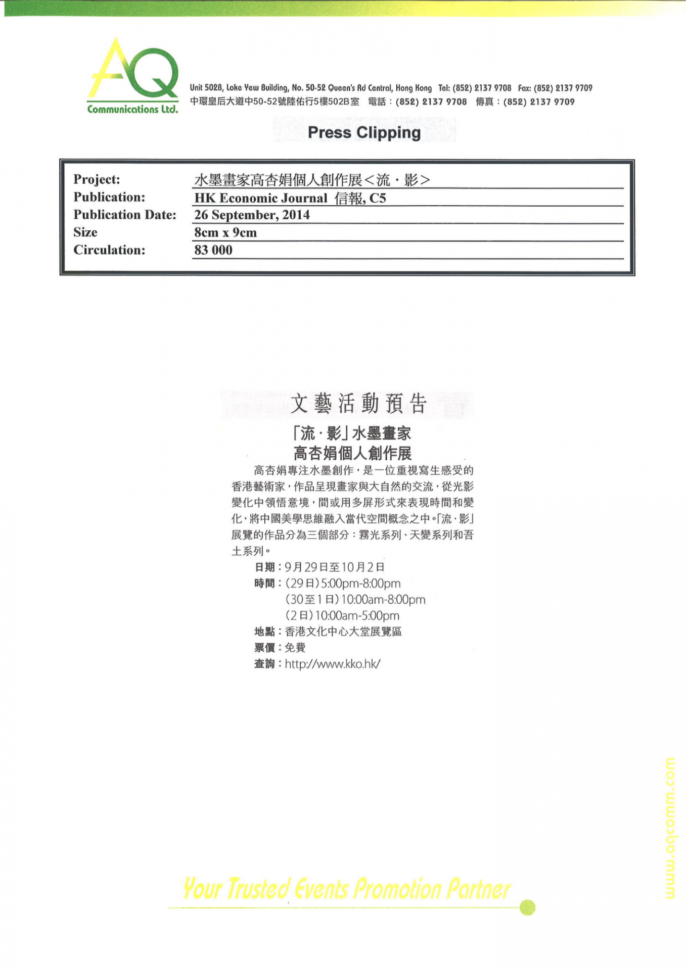 憑藉豐富的經驗和網絡,AQ能為客戶提供最合適的服務。在此項目上,AQ負責媒體關係及其相關服務,包括編寫和翻譯新聞稿丶傳媒採訪邀約、安排一對一訪問丶跟進傳媒報導以及撰寫總結報告。